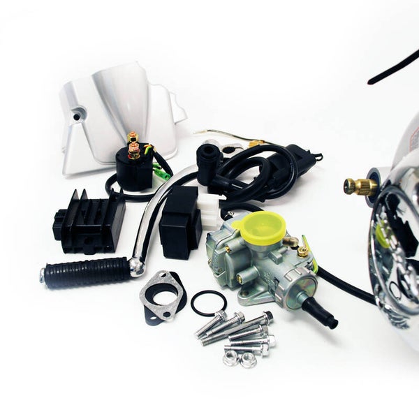 - Included: Carburetor, intake manifold, CDI, volt regulator, ignition coil, kick & gear pedal, Wiring diagram.